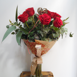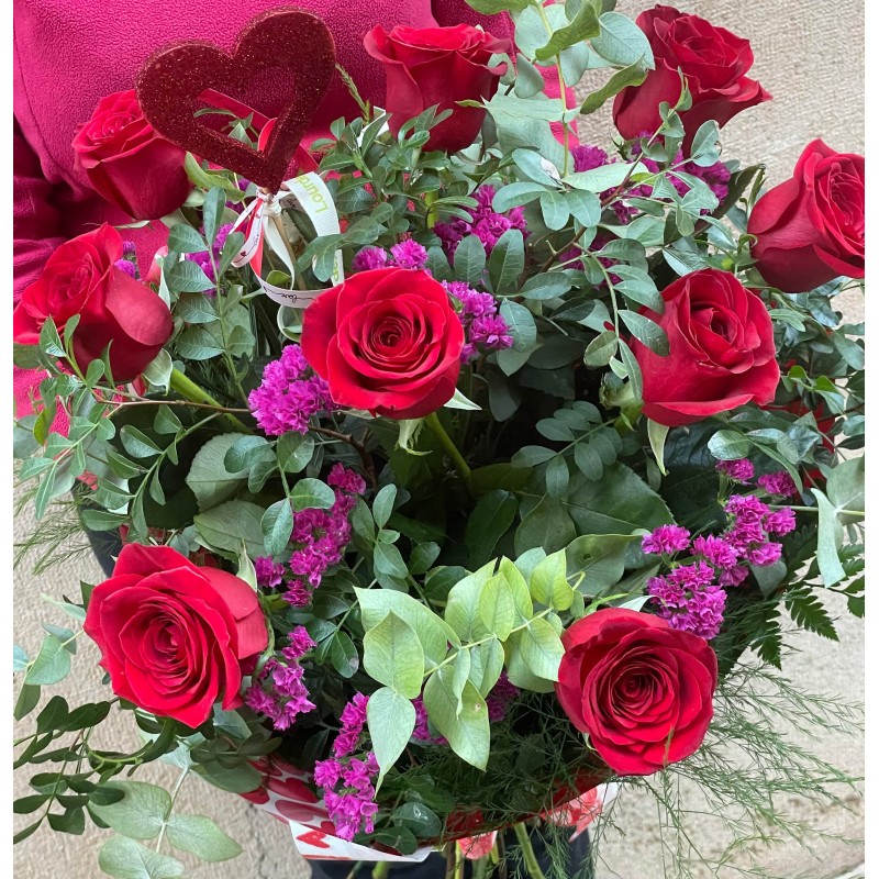 Peluches Love 12,00 € Precioso ramo de 9 grandes rosas rojas, de la mejor calidad, tallo largo de 70cm. Por supuesto, con sus verdes y decoración de San Valentín.